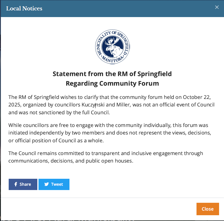 But the success of the Public Meeting clearly made some people nervous. The next day, an unsigned “official” Statement appeared on the RM of Springfield website, claiming the “community forum was not an official event of Council and was not sanctioned by the full Council.” There was no Council vote. No approval. No discussion. Yet the statement was released publicly, as if to discredit the councillors who dared to hold the meeting. Mayor Therrien, nor CAO Draper have the authority to act on their own and release official RM of Springfield documents. The statement further said, “The Council remains committed to transparent and inclusive engagement through communications, decisions and public open houses.” This was not transparency. This was damage control. The statement was posted on the RM’s Facebook page. Residents immediately saw it for what it was, an attempt to undermine and silence the voices of those who showed up and pushed back. “It felt like they were trying to tell us we shouldn’t have been there,” said one attendee.